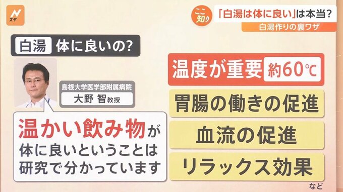 島根大学医学部附属病院の大野智 教授によると、温かい飲み物が体に良いということは、研究で分かっているとのことです。